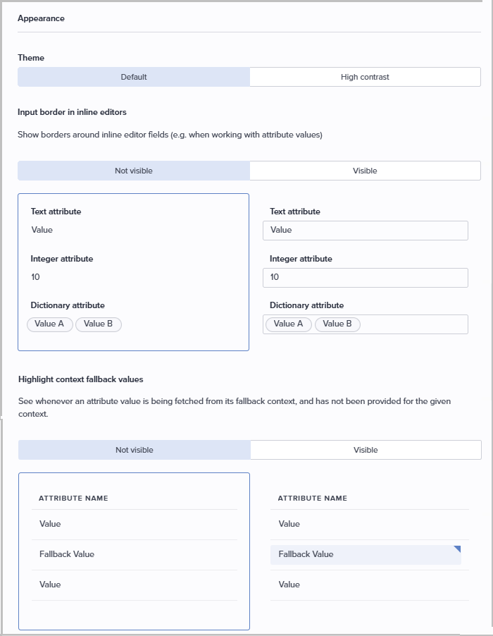 When enabled, input borders make editable fields easier to identify and interact with. This can be especially helpful for users with cognitive or visual impairments, as it improves clarity and focus during data entry. - Highlight context fallback values: