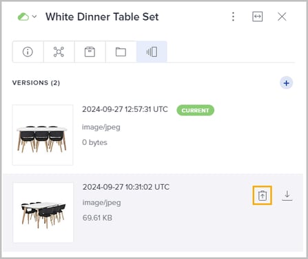 To set a previous asset version to the current one, hover the relevant version and click the restore bin button: