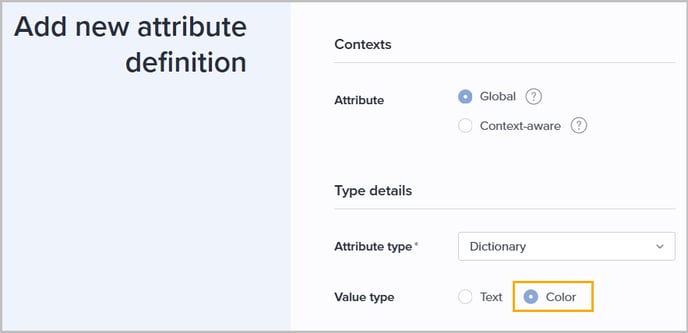 You can now use the 'Color' value type in dictionary attributes, allowing color values to be defined directly within dictionaries. This improves visual representation and enables easier customization across your product data: