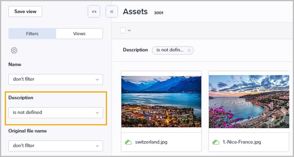 We have aligned the Assets filtering options with the Product module. When filtering by Name, Description or Original file name, you now have access to a full range of operators, such as 'is defined' and 'is not defined'. This allows you to quickly identify assets with missing metadata.