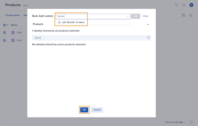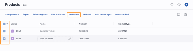 Any labels already added to one/more of the selected products are presented. - Click the plus icon (Add) to add a label to all selected products.