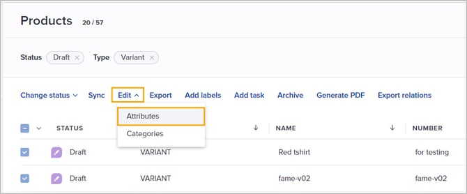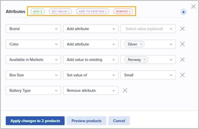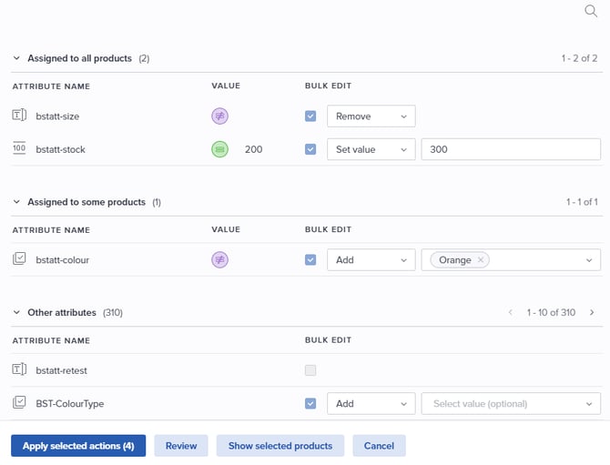 The 'Edit attributes' feature allows you to efficiently add/remove attributes or set/update attribute values to a large number of products at the same time.
