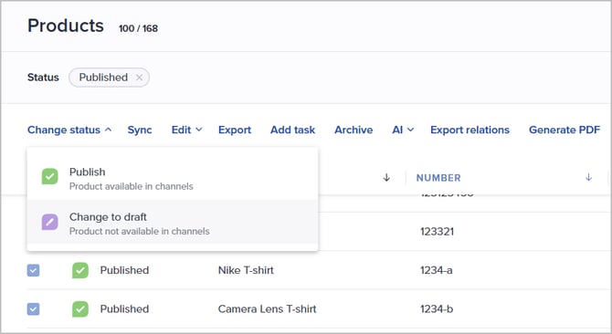 - Click Change status from the action menu, and select the status you want to update the products to.