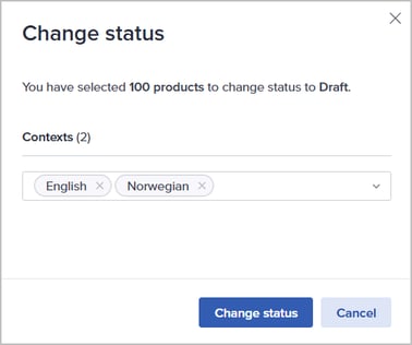 You can easily change the product status of a set of products across multiple contexts in a single operation.