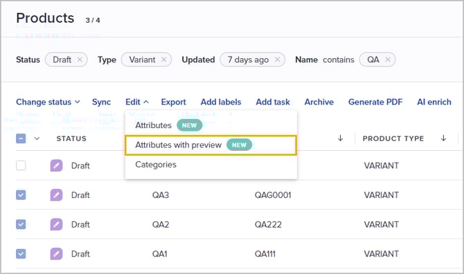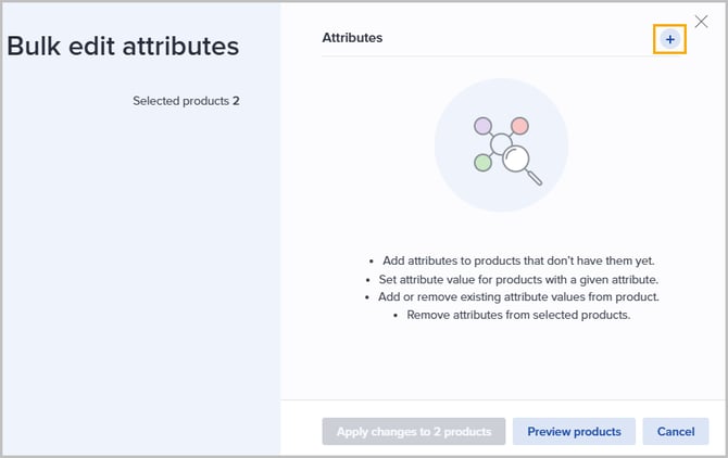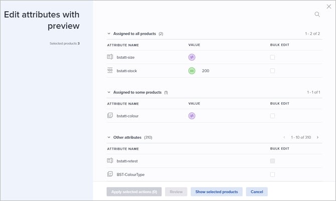 The 'Edit attributes with preview' feature allows you to update a set of products in bulk, based on information about which attributes are shared between the products.