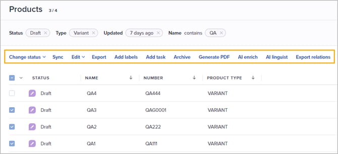 Once you've finished establishing your data model and imported products into your catalogs, you can process multiple products simultaneously by utilizing bulk actions. These features allow you to make changes efficiently, saving valuable time and effort.