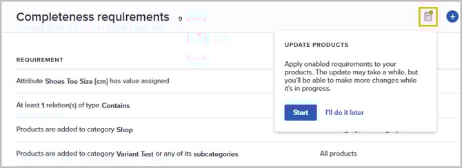 Tip! Please see View completeness score on how product/category scores are presented. Please see Create a completeness requirement for details on how to set up requirements.