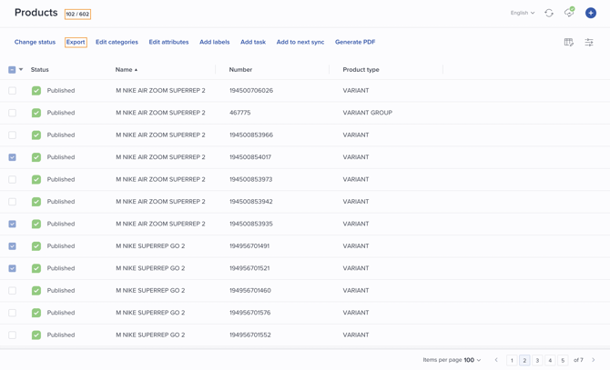 - Filter the products you want to export or choose a catalog or category. Then select some or all products by using the checkboxes.