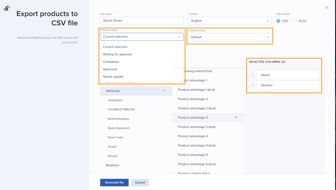 Please note: Export supports attributes, assets, relations, and categories. Use Advanced export and column setup to configure your export.