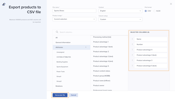 Please note: The total number of cells that can be exported in one session is 50.000.000. The maximum number of products/rows is 500.000 and the maximum number of columns is 500.