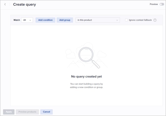 - If you want to preview the products matching the query, click Preview products. Please see Preview the query result for details.