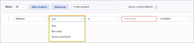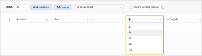 - To find products that have or are missing specific information in a given context, select Ignore context fallback at the top. This ensures that any values from the fallback context are not taken into account.