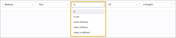 Operator Returns products contains where the specified string is found not contains where the specified string is not found is where the specified value matches is not where the specified value does not match is assigned to product having the specified attribute assigned is not assigned to product not having the specified attribute assigned between where the value is within the specified range is not between where the value is not within the specified range greater than where the value is greater than the specified value smaller than where the value is smaller than the specified value equal or greater than where the value is equal to or greater than the specified value equal or smaller than where the value is equal to or smaller than the specified value starts with where the value begins with the specified string ends with where the value ends with the specified string all of these having all of the specified values none of these not having any of the specified values not all of these not having all of the specified values some of these having one/more of the specified values value is defined having any value value is not defined not having a value (will also include products where the attribute is not assigned) Date/Date and time specific: last 7/14/30/90 days days ago next 7/14/30/90 days days from now - Specify the value according to what you want to include/exclude, depending on your previous selections:
