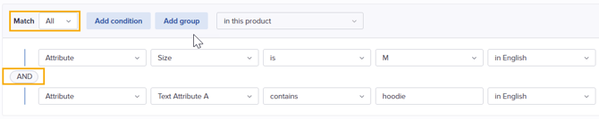 - If you have added more conditions, select whether All or Any (at least one) of the conditions must be fulfilled. In the following example, both conditions must be fulfilled for a product to be returned from the query: