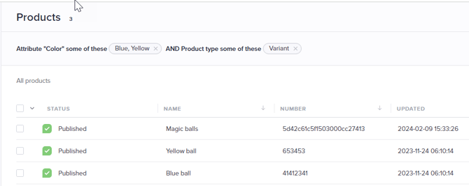- Add relevant filtering criteria by e.g. adding text in the Name field and selecting two Product types.