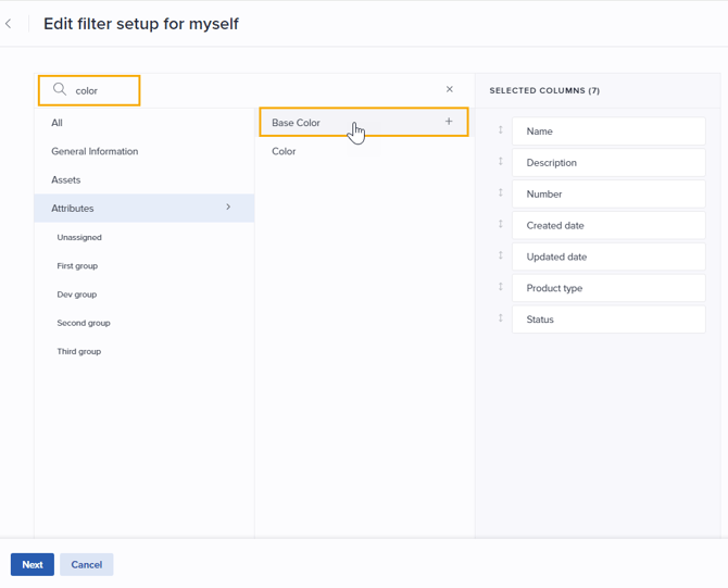 - You can use the search field and/or select the relevant attribute group to find the fields/attributes you want to include. Filtered fields/attributes are listed in the middle column.