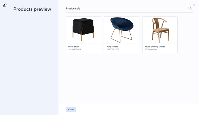 - Click the Preview products button to open a separate page listing the matching products as tiles. The product name and number are presented for each product.