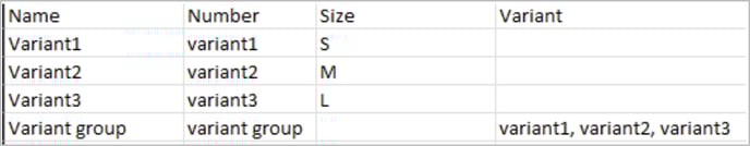 1) The following file is prepared for import. The file will be read from top to bottom, so the products to be contained in the group must be listed first. The last entry will link the variants to the group by referring to the product numbers in the Variant column: