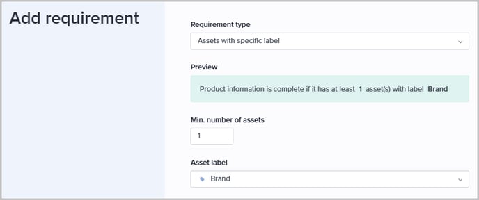 Use this requirement type when products must have at least the specified number of assets assigned, tagged with the selected label: