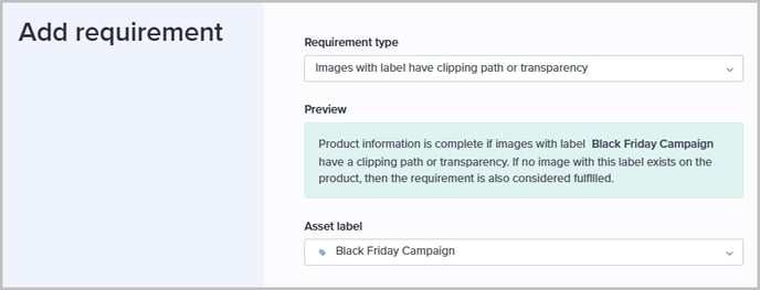 Use this requirement type when products have an image tagged with the selected asset label, and that image must have either a clipping path or transparency applied: