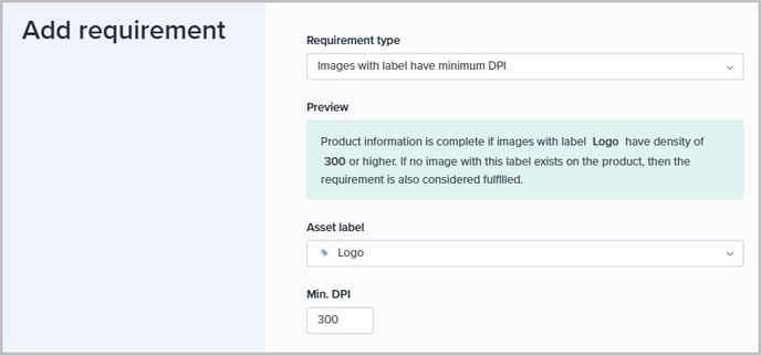 Use this requirement type when products have an image tagged with the selected asset label, and that image must have at least the specified density: