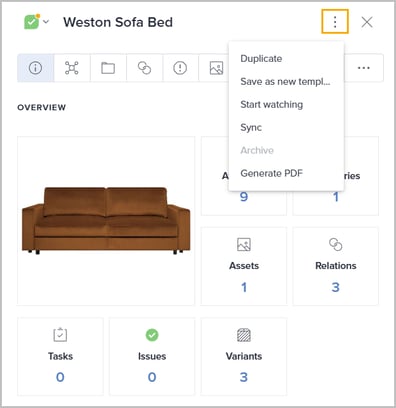 The product Details panel is a centralized view of all information linked to a product, including attributes, categories, relations, assets, tasks and more. The information is neatly organized in various tabs for easy access.