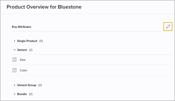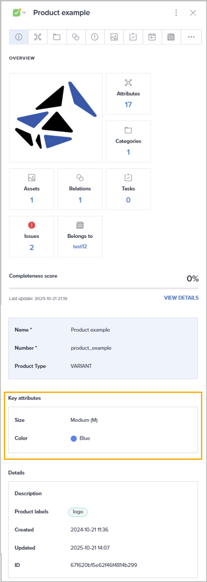 Within the Overview tab, there is a dedicated section that displays up to 10 key product attributes defined at the organizational level. These attributes are visible to all users.