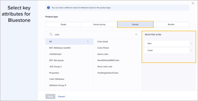 - Select the relevant product type on the top. Any columns already included as key attributes are presented in the right panel.