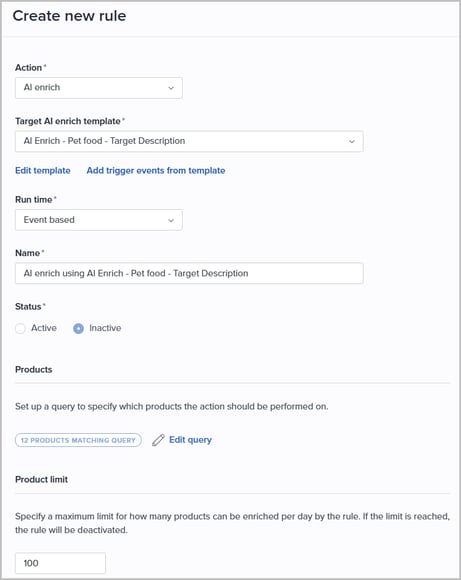 - In the Product limit section, define a maximum daily quota for product enrichment. The rule will automatically deactivate once this limit is reached. Manually re-activating the rule will reset the daily quota.
