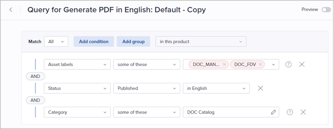 - Click Edit query in the Products section to define conditions for products to be handled by the rule: