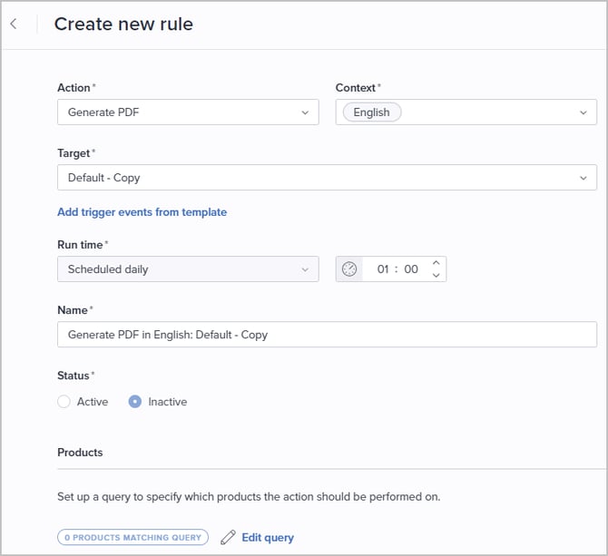 The system will by default try to generate triggers automatically based on elements used in the connected query. For 'Generate PDF' rules, elements used in the PDF template will be added as triggers when Add trigger events from template is selected.