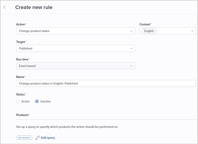 - Select Change status to Draft/Published if the query conditions do not match in the Additional action section if you want products not matching the query to be set to the status not selected as Target.