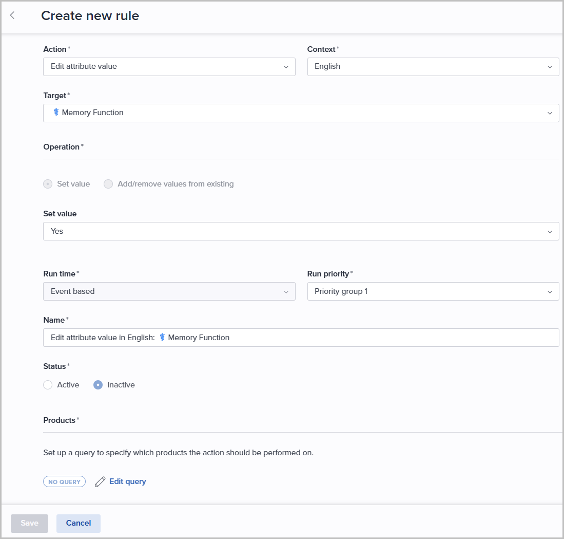 The Rules engine allows you to automate different types of time-consuming tasks/actions. An action will be performed for the set of products matching the specified query. Currently, Bluestone PIM supports the following types of rules/actions:
