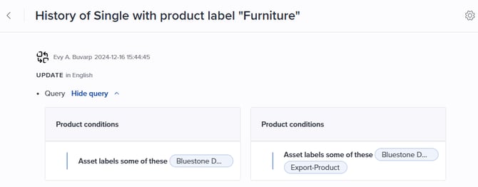 Allows you to view the history for each rule, including changes in the query: