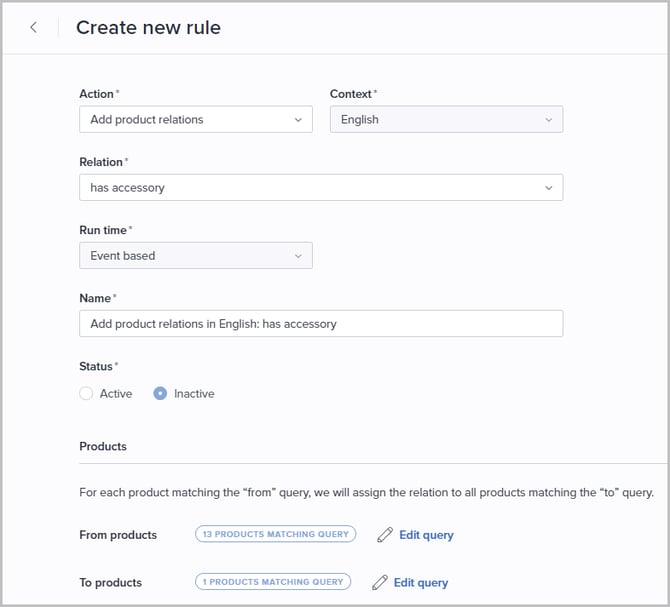By creating a rule for automatically creating product relations, you can ensure that relevant product connections are established as soon as possible due to other data being added, updated, or removed in Bluestone PIM.