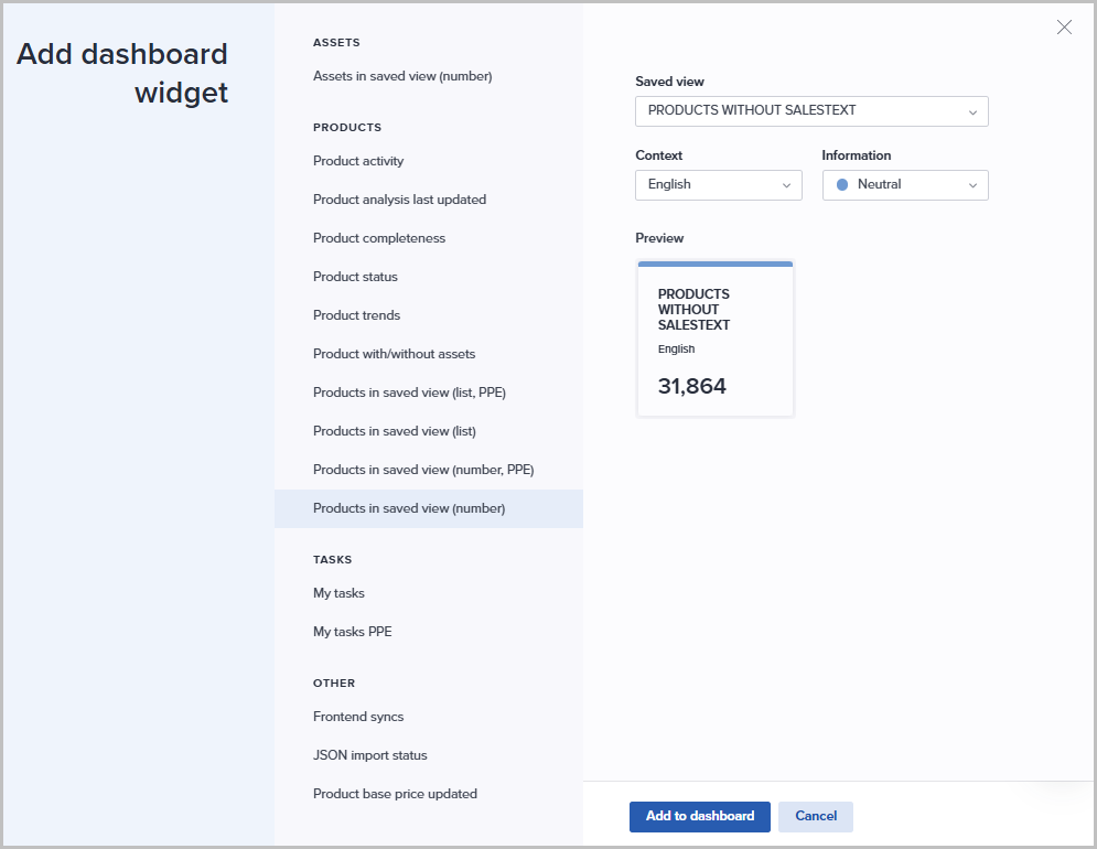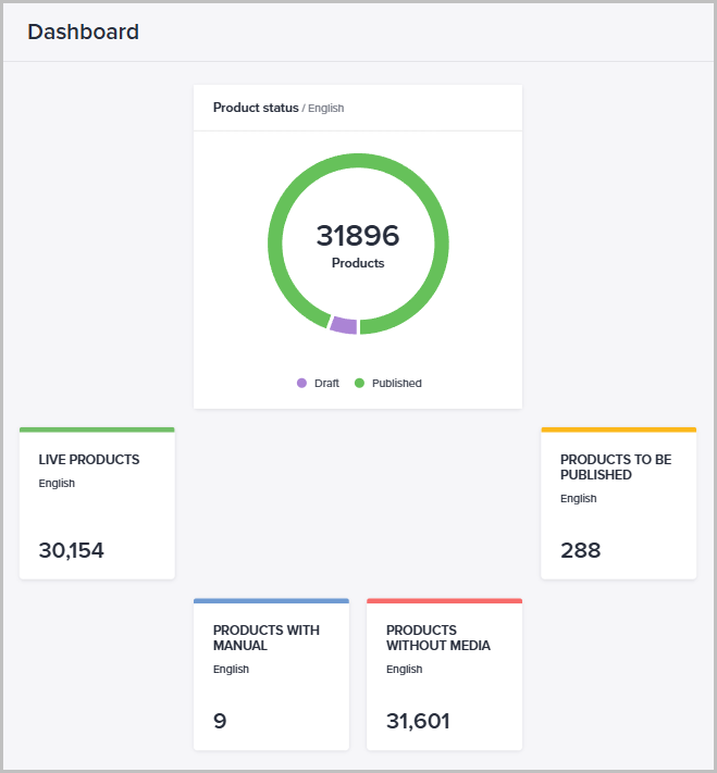 The Dashboard consists of customizable widgets sourced from products, assets and tasks information in PIM. Set up your own dashboard presenting information in a way that suits you the best.